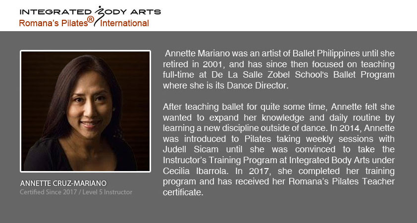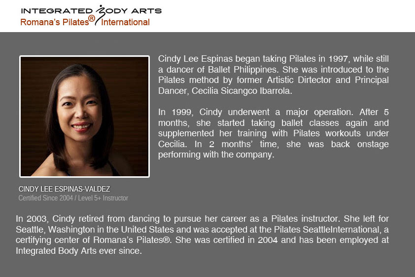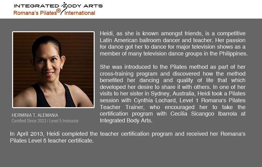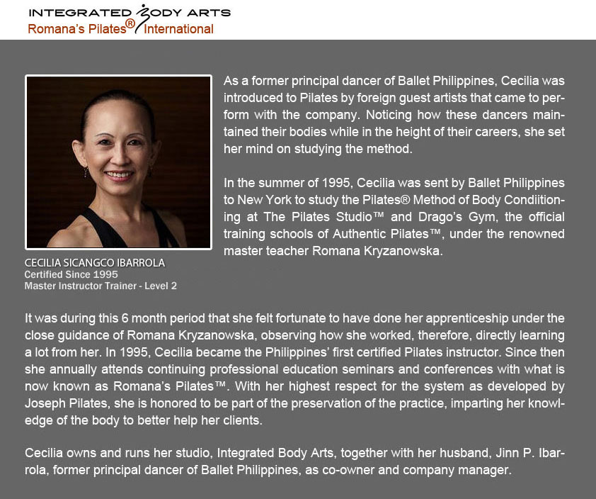Integrated Body Arts offers the only Romana’s Pilates International® Teacher Certification Program in the Philippines under the supervision of Cecilia Sicangco Ibarrola, Master Instructor Trainer, Level 2.